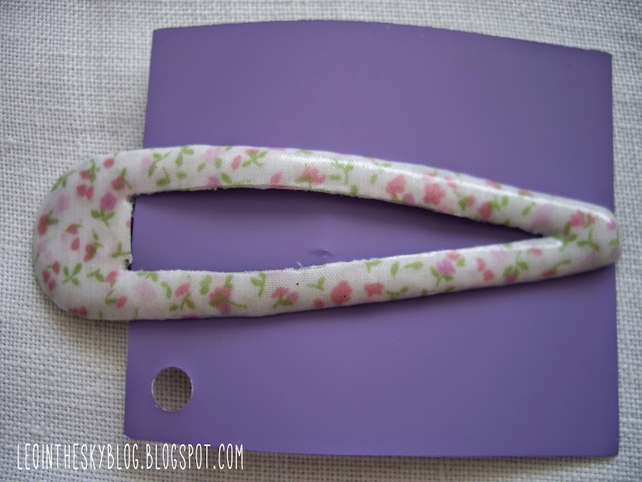 Ponemos la horquilla en un cartoncito y la impregnamos bien con la cola. A continuación cortamos un rectángulo de tela un poco mayor que la horquilla y la ponemos sobre ésta. Una vez seca la cola cortamos con las tijeras alrededor de la horquilla, lo mejor es usar unas tijeras de precisión, yo no tenía y acabé cortándolo con unas pequeñas de manicura.