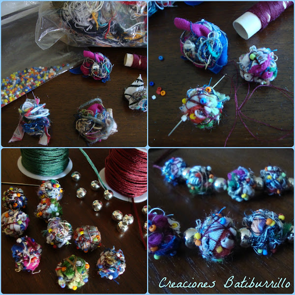 Vamos guardando en una bolsa todos los restos de hilos y pequeños recortes de telas de diferentes labores, lo mismo que los extremos de los cordones de la bisutería. Todo vale, porque al final se juntan en un amasijo de color.Tomamos pequeñas porciones de tamaño aproximado que lleven un poco de todo y las amasamos en la palma de la mano dando forma de bolita.