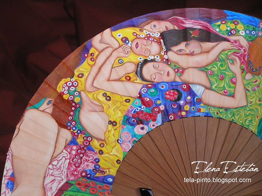 Cuando me encargaron que pintase un abanico que estuviese inspirado en el cuadro de Klimt La Joven, La Virgen, o Las Vírgenes, ni siquiera conocía esta obra de Klimt. Tenía que reducir y adaptar el tamaño de este cuadro de casi dos por dos metros al país de un abanico.