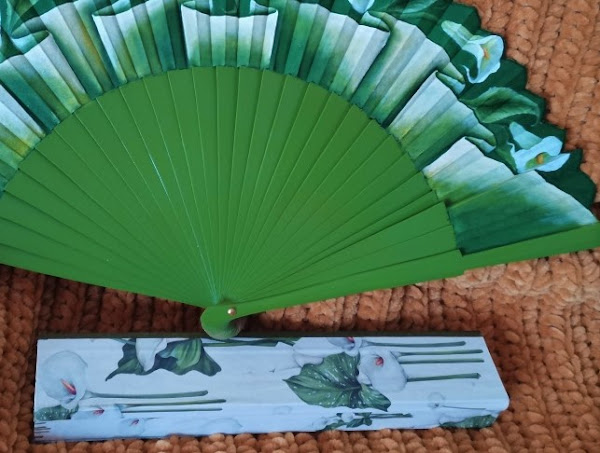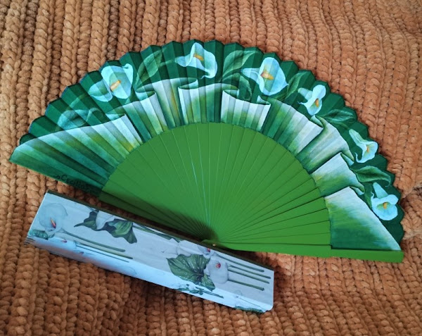 y en esta ocasión, también le he hecho una cajita en cartonaje con dibujo de calas ,que dicho sea de paso me encanta como ha quedado, porque aparte de bonita y proteger el abanico la puedes dejar a la vista y tenerlo siempre a mano