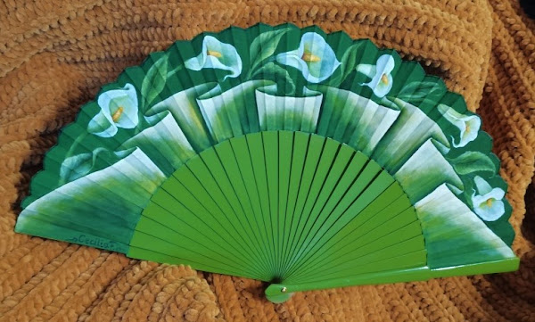 Como podéis ver ,he escogido dibujo de volantes y flores, para este abanico unas calas blancas