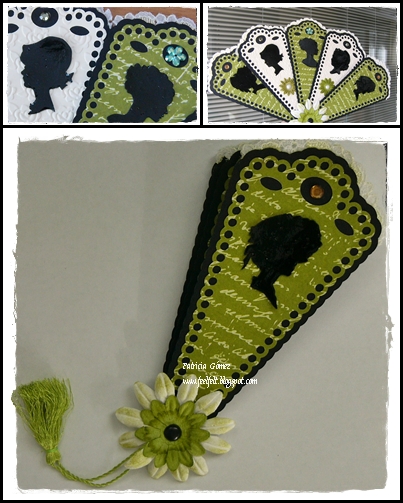 Las siluetas de mujeres y las formas del abanico estan recortadas con mi craft. Las cartulinas de color beige estan embosadas con placas Cuttlebug. Todo el abanico esta rematado con una puntilla blanca con motivos verdes.