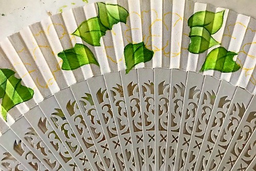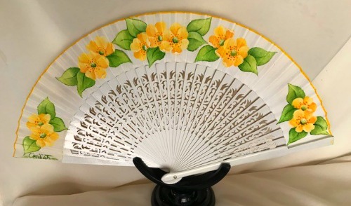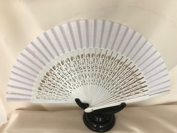 En esta ocasión le voy a pintar un abanico a juego y para ello escojo un abanico con el varillaje troquelado y lacado en blanco y yo decoro el país.