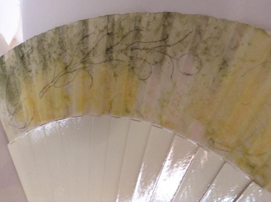 Una vez seco el fondo planteo un dibujo,siempre digo que los dibujos hay que hacerlos en papel vegetal para luego pasarlo al abanico,pero también lo puedes hacer directamente,y eso es lo que he hecho yo en en este caso.