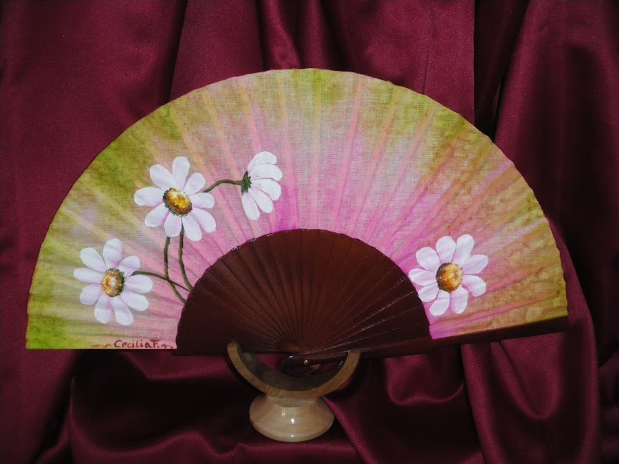 y este es el ultimo de los abanicos que envié a la exposicion de San Nicolas....es un trabajo distinto en el que el fondo esta pintado con acuarelas y sobre el pintadas las margaritas....me encanta este tipo de trabajo y al natural es aun mas bonito.