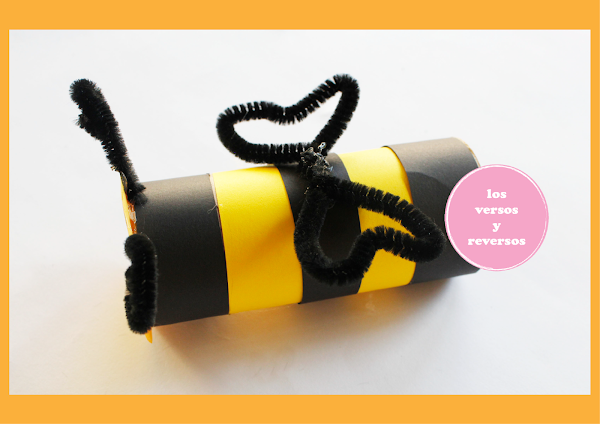 Para hacer el cuerpo, forra el rollo de papel con el papel amarillo. Después, haz 3 tiras de papel negro y ponlas alrededor del cuerpo de la abeja.