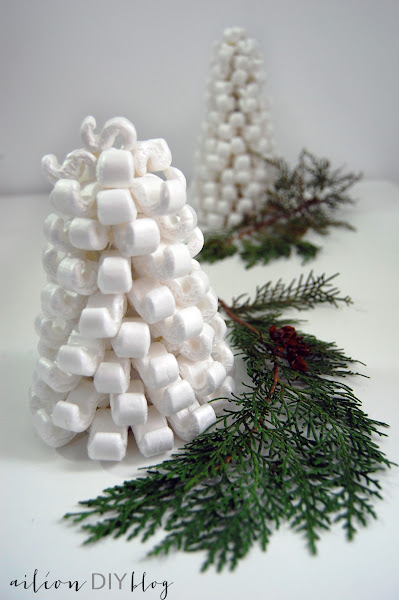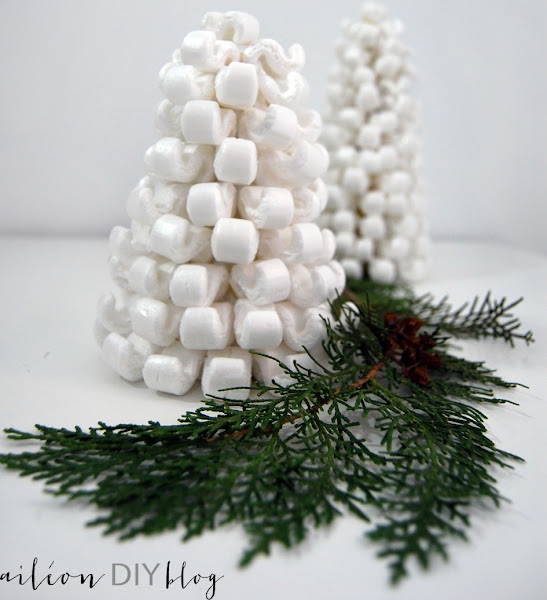 Pues bien, este DIY viene de eso, de un día que recibí una caja con algo y decidí guardar los chips estos de corchito blanco que vienen protegiendo el objeto... Me dio mucha pena verlos en la basura así que enseguida se me encendió el chip creativo y voila! nacieron estos abetos nevados, muy ideales para la decoración invernal.