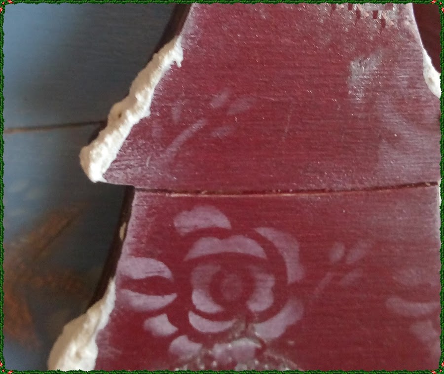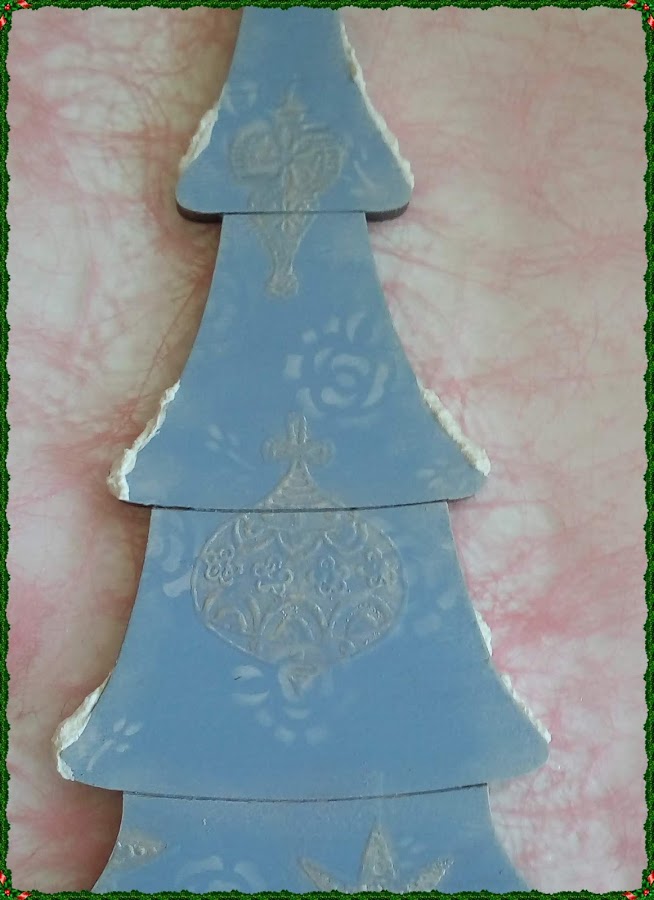 Haremos unos adornos con una plantilla de stencil, con acrílica en color blanca, muy muy suave, para lo cual descargaremos mucho el pincel y lo haremos sin apenas ejercer presión haciendo círculos con el pincel sobre la plantilla, así conseguiremos un dibujo difuminado y con distintos tonos en unos lados y en otros.