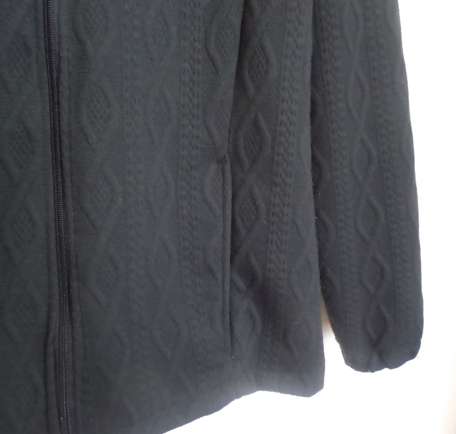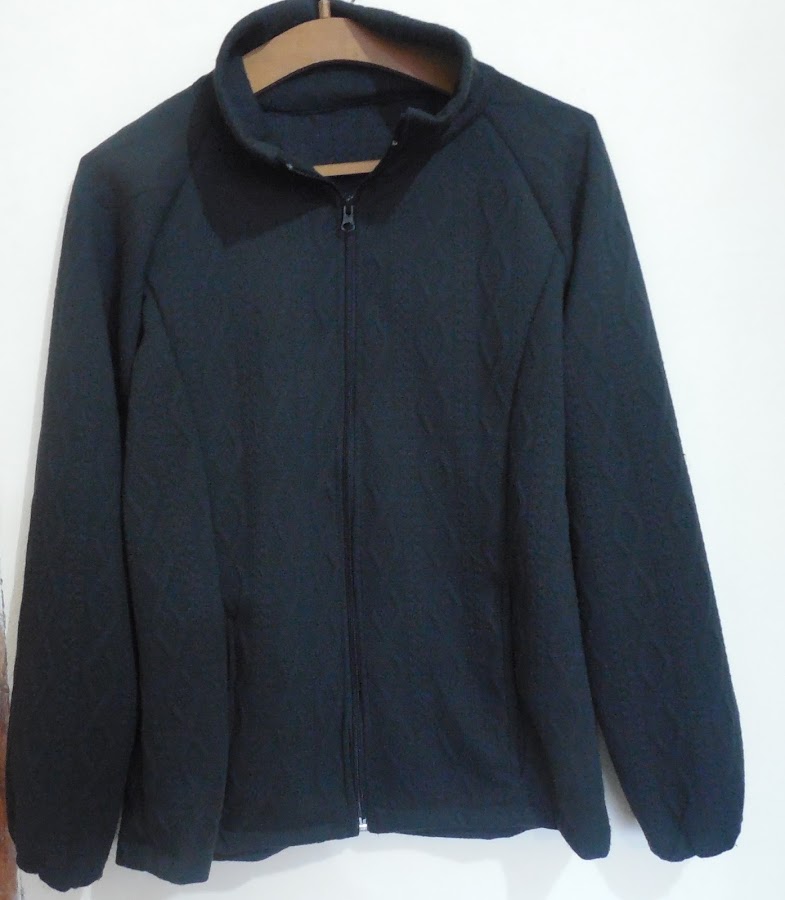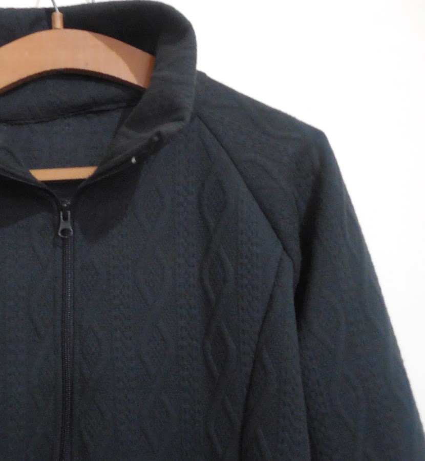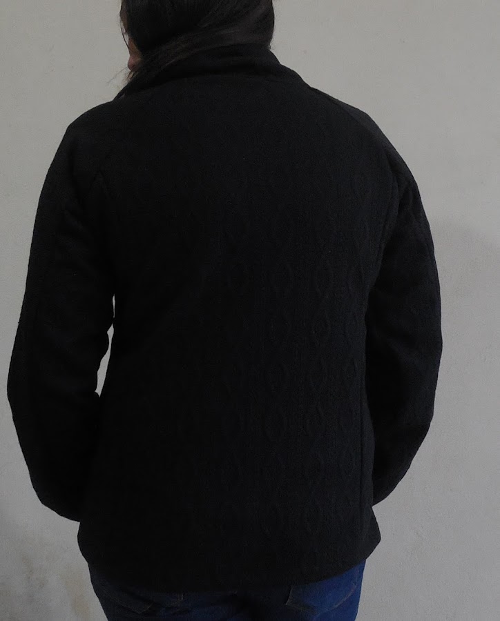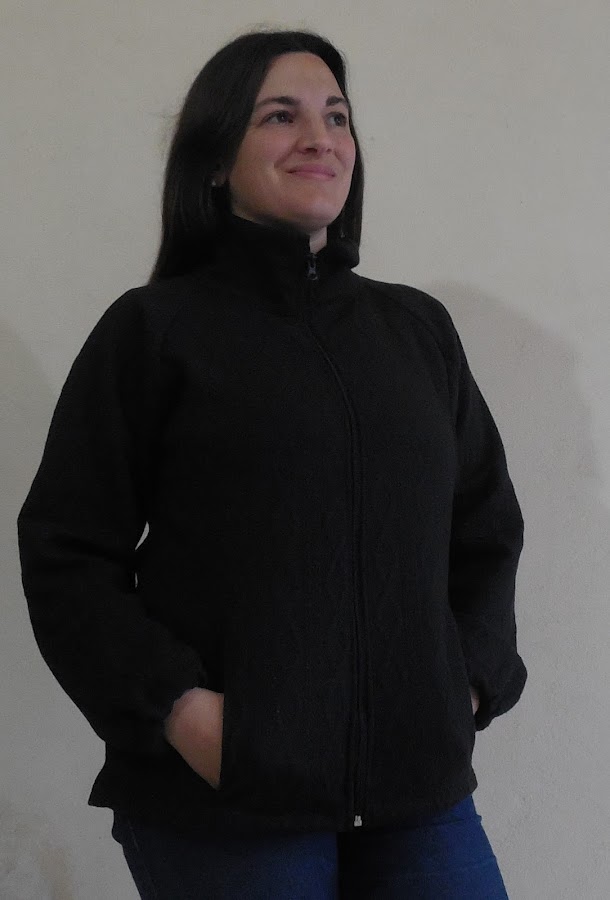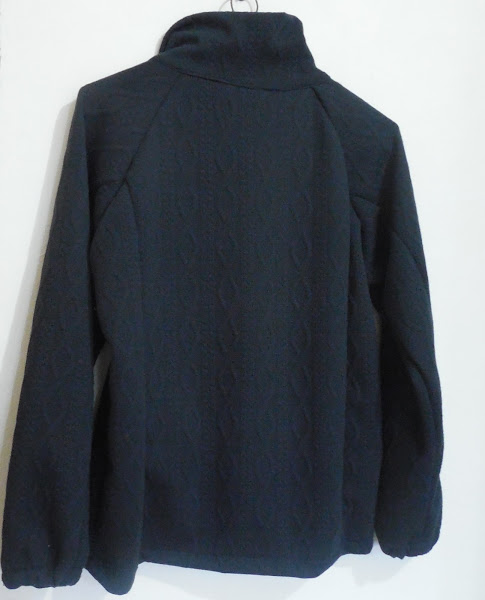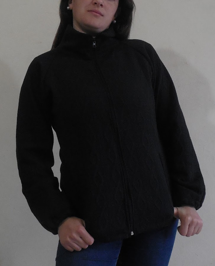 En la espalda también lleva dos costuras que le da cierto entalle. Las mangas ranglan, con puños terminados con elástico. El cuello bastante alto.