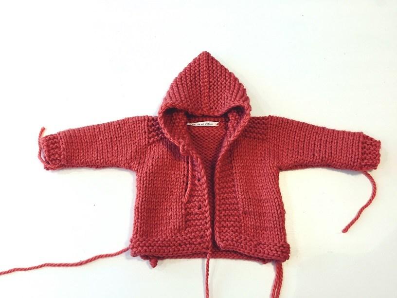 Une el perfil del abrigo y de las mangas. Puedes ver como unir dos piezas tejidas a punto jersey aquí y aquí.