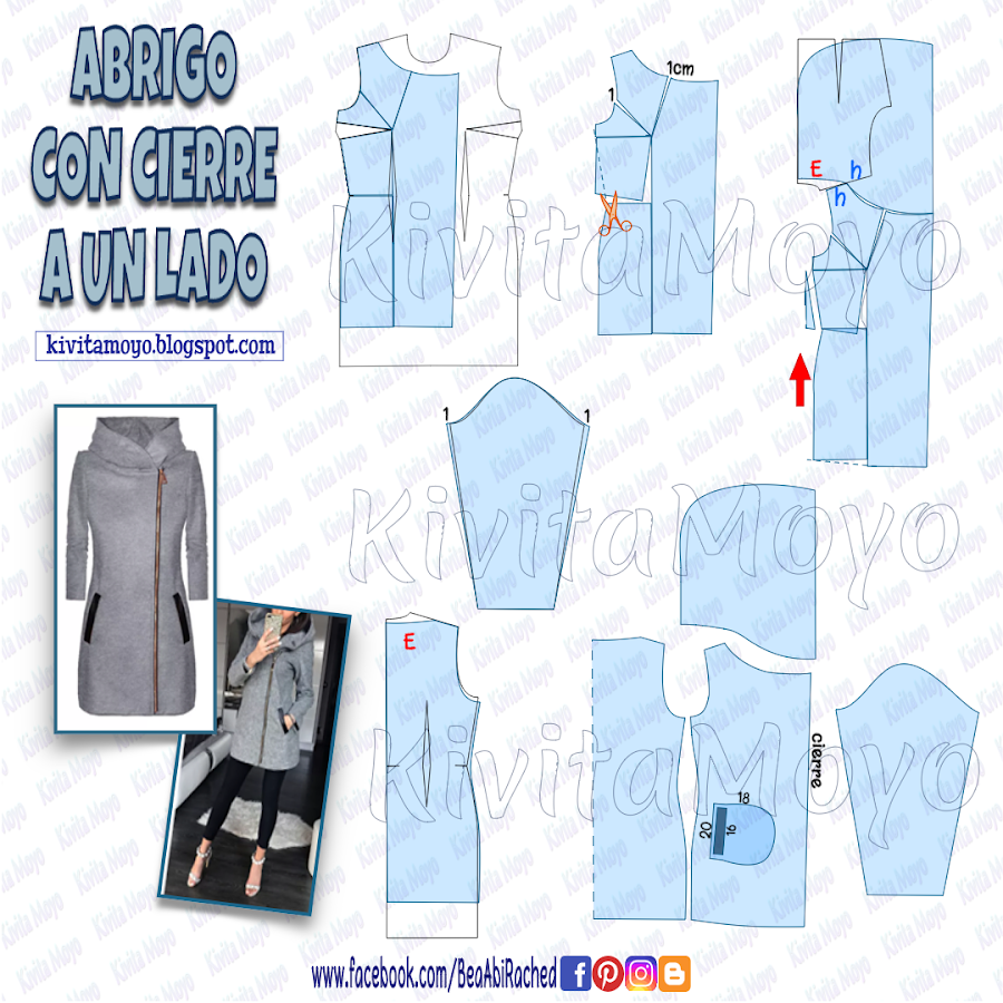 Las delanteras se cortan iguales. El cierre se coserá en un lado de una delantera. puede ser solo apoyado o bien cortando ese lado de la delantera dando el margen a cada sección; coser el cierre atrapado entre estas. Luego la otra parte del cierre se coserá en el filo de la otra que monta. La parte sobrante que queda en el interior se sujeta con un broche o botón interno.
