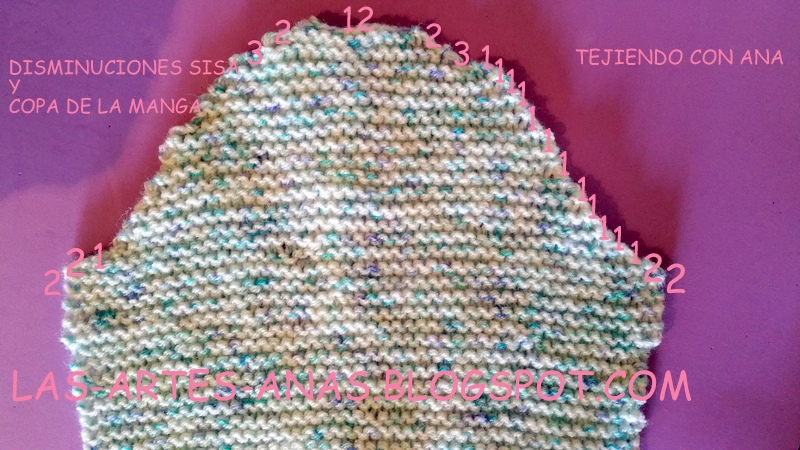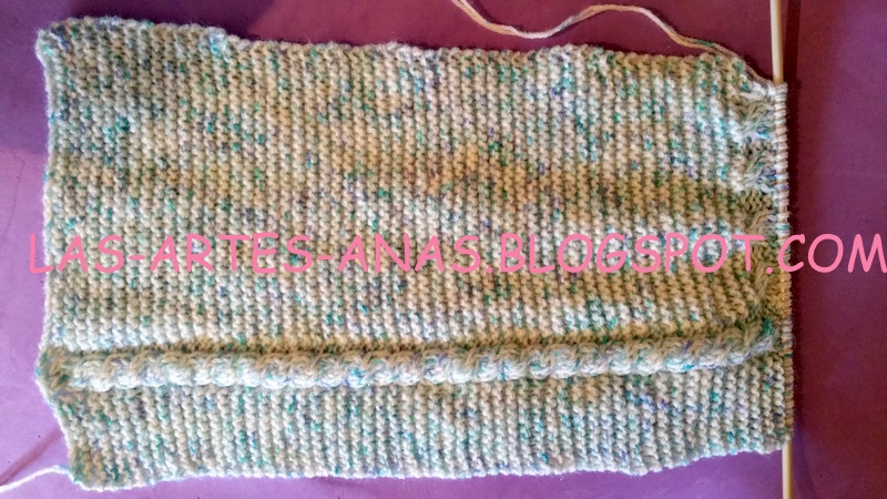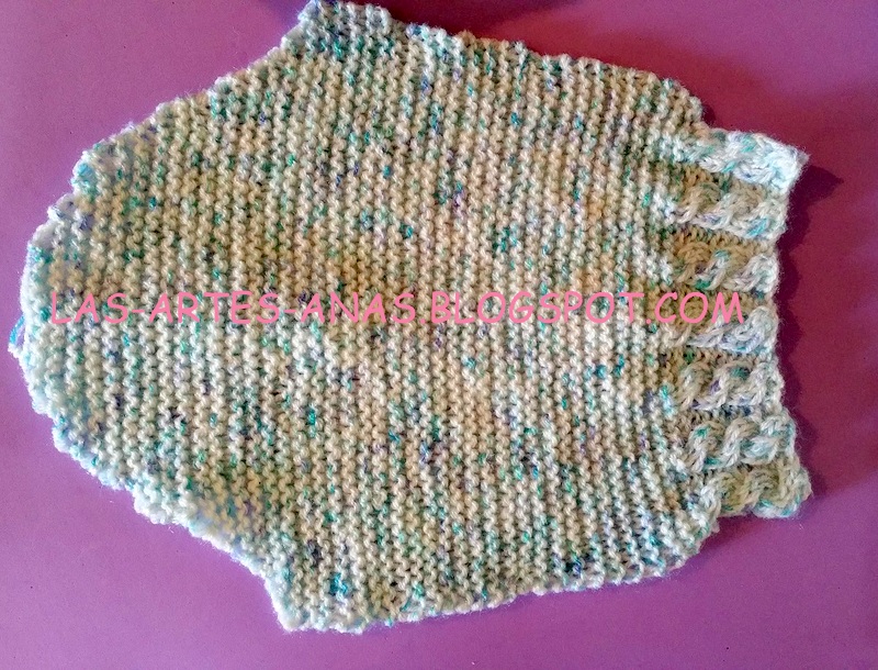 Ahora vamos a comenzar la parte de la ESPALDA, montando 85 puntos, TEJIENDO A PUNTO BOBO TODO, DISMINUYENDO 1 PUNTO A CADA LADO CADA 30 pasadas 3 veces, NOS QUEDAN 79 PUNTOS continuar como en los delanteros, hasta alcanzar LA SISA, DISMINUIR EN CADA SISA 2-2-1 y 5 puntos más REPARTIDOS entre las trenzas , NOS QUEDAN 62