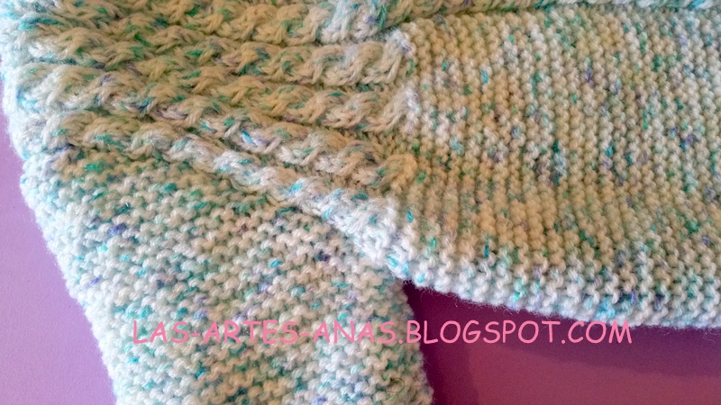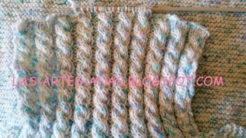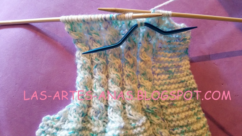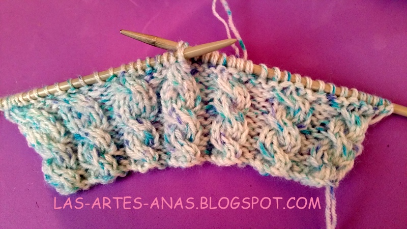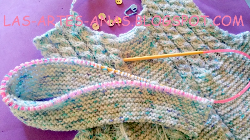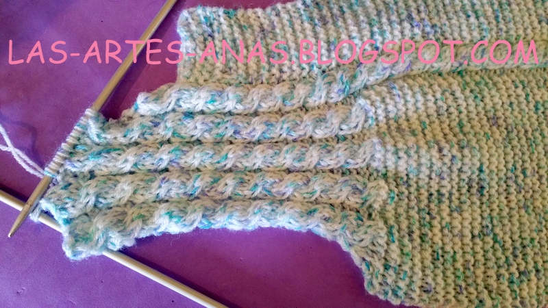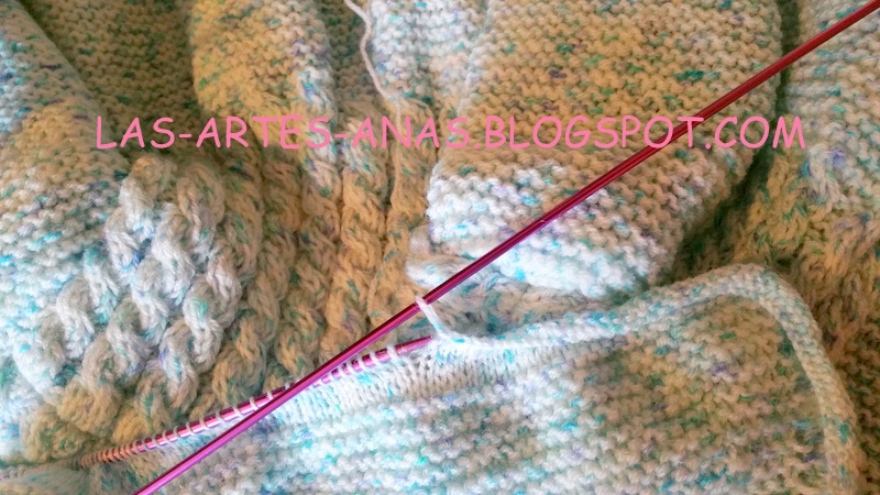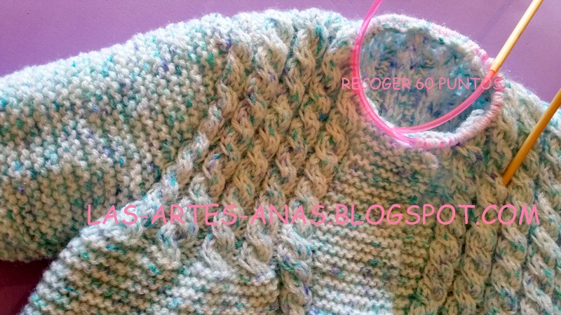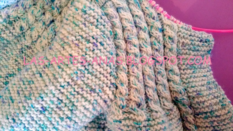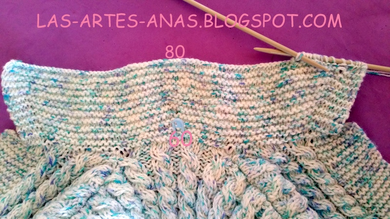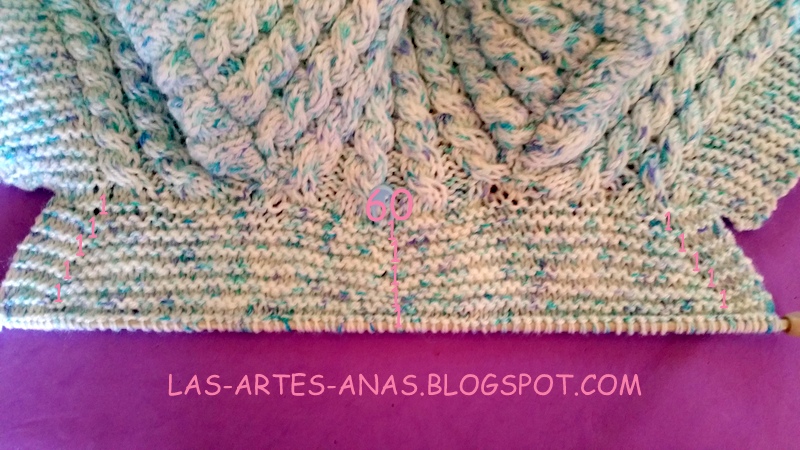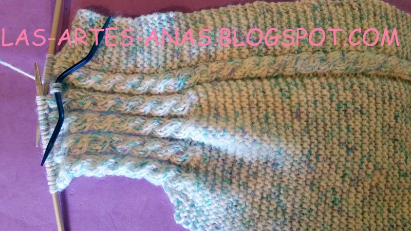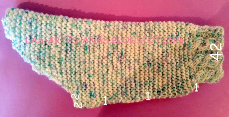 AHORA VAMOS A TEJER LAS MANGAS, empezamos con 42 puntos y 2 motivos de trenzas, os recomiendo que tejáis ambas mangas de una vez