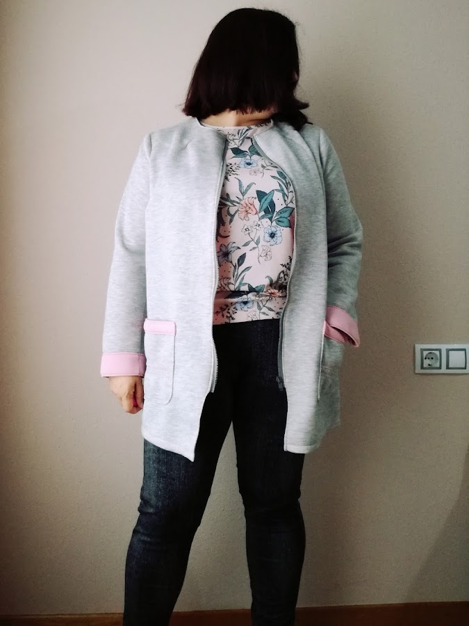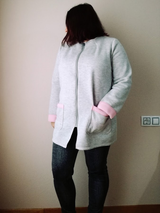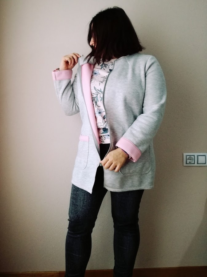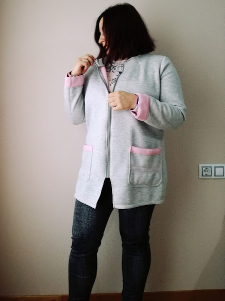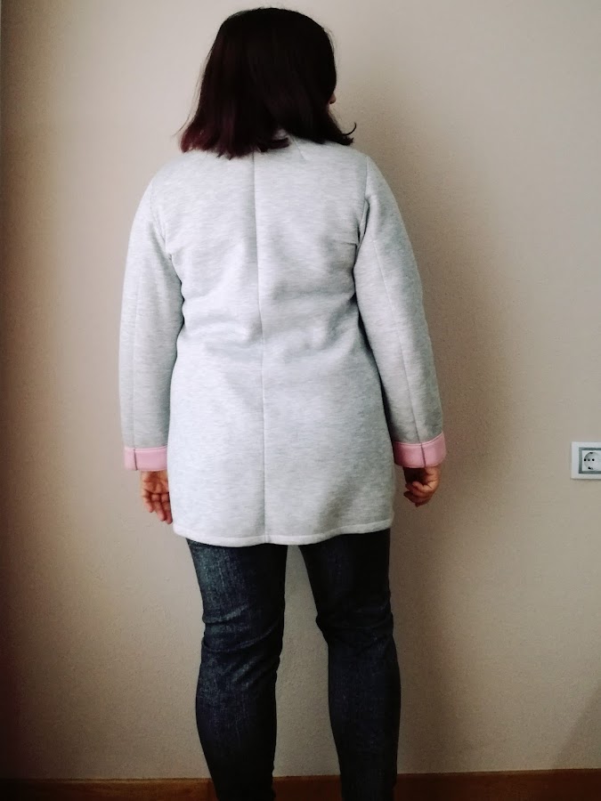 El modelo es el Timeless Tailoring de la revista Ottobre Woman 5/2016. Iba a hacer mi propio patrón, pero ese se parecía bastante a mi idea, así que sólo lo modifiqué. Lo acorté, le rebajé un poco el frente para que no traspasara, solo se encontrara, y añadí unas pinzas en el cuello. Cuando tienes mucho pecho, a veces son necesarias más pinzas..... El tejido me quedaba muy levantado.