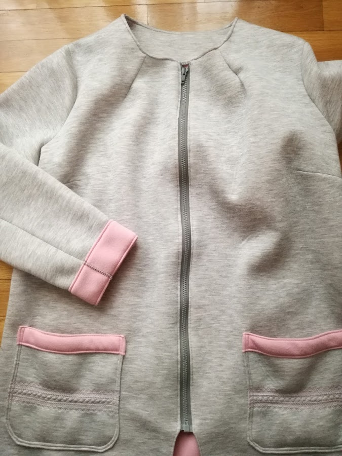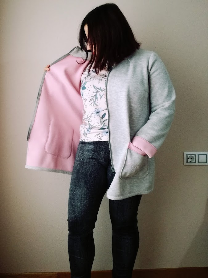 El caso, la tela es un neopreno de doble faz que compré en Encants en Barcelona. Es muy bonito, lo había en dos combinaciones de color y muchas de mis amigas y yo acabamos comprando. No abriga demasiado, pero es ideal para entretiempo.