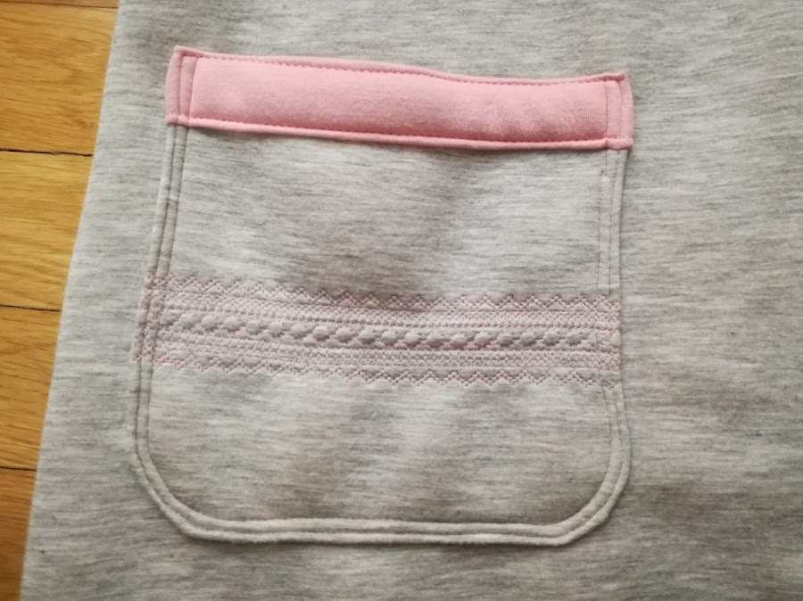 Quise darle una vuelta de tuerca a los bolsillos y los decoré con una puntilla hecha con las puntadas decorativas de mi máquina de coser y un hilo del mismo rosa que el interior del abrigo.