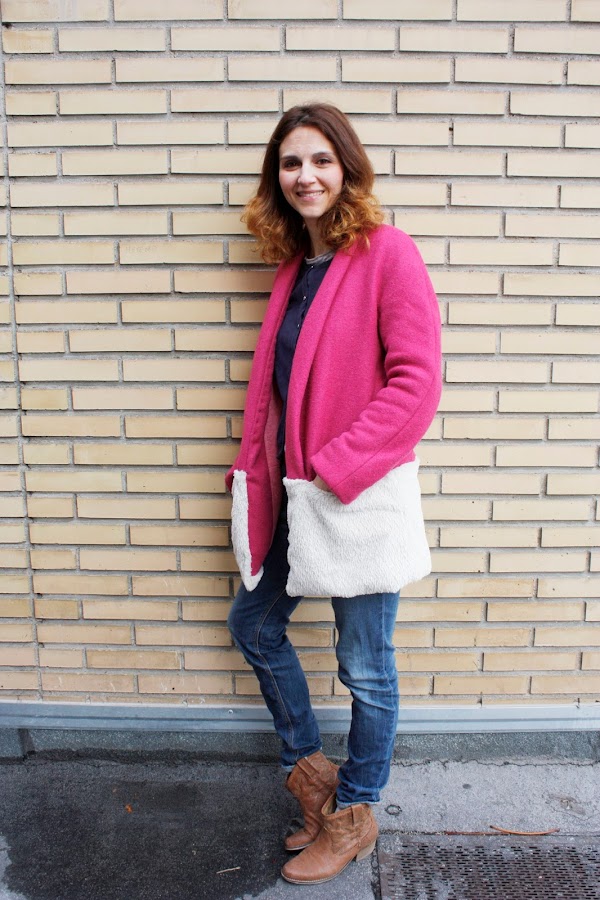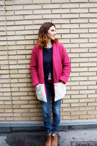 Aquí os dejo fotos de mi versión con paño fucsia y pelo beisg de tejidosdemoda y forro de punto rosa.