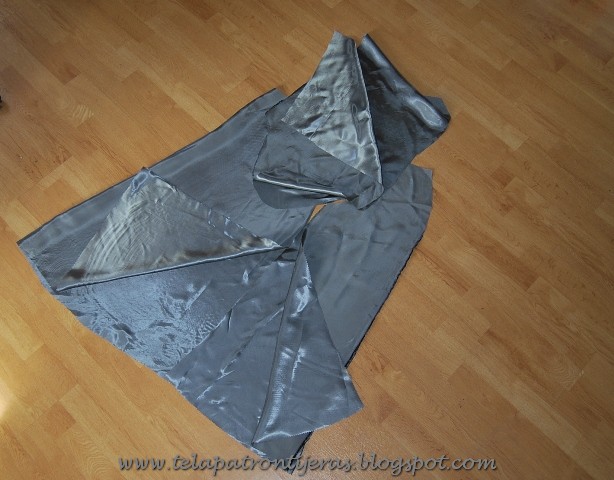 Con el raso gris, cortamos todas las piezas del forro y lo montamos y cosimos normalmente, planchando las costuras abiertas.