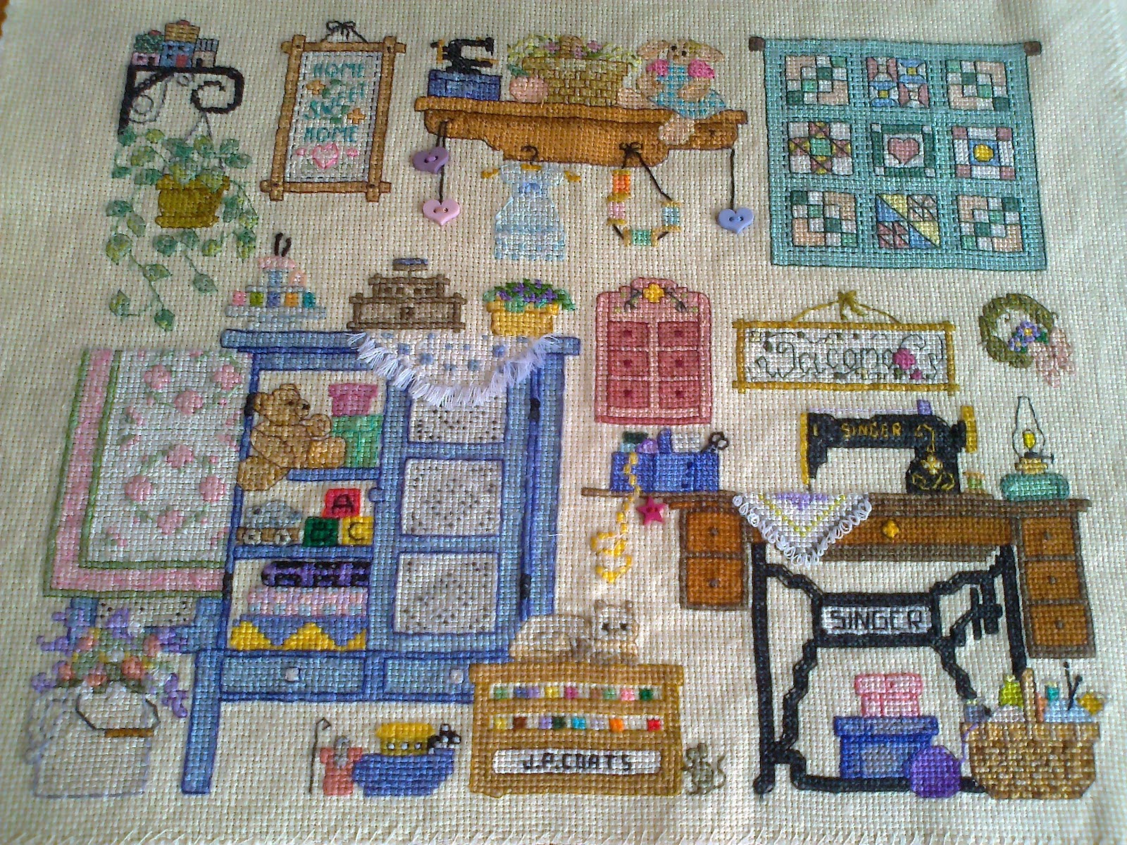 Hola queridas amigas virtuales FELIZ VIERNES ya he terminado este cuadrito a punto de cruz que lo he ido llevando como una labor comodín !Y claro me ha durado casi 1 año! y eso que es monísimo, los hilos no son los que indican la labor pues a mí me pasó el gráfico una amiga forera y como estaban en un idioma nórdico si no recuerdo mal, no conocía la marca, pues he ido usando los que tengo en casa. Supongo que las maestras en punto de cruz se deben llevar las manos a la cabeza !debe ser pecado! alterar la labor jajajaja. pero como es para mí, lo voy a colgar en la pared de mi medio cuarto de costura real (Que está a medio construir, la otra mitad está en mi pensamiento) Ufffff que ganas de enrollarme que tengo hoy.