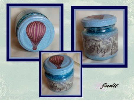 Bueno, también terminé este bote ambientador. Está realizado con sal gruesa, colorante alimentario y perfume. Lleva pintura, deccouppé y poco más.