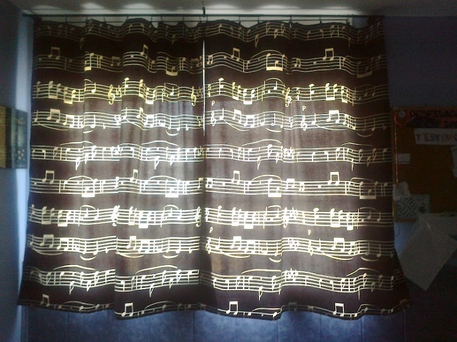 El en su nueva habitación tiene mucha luz con una ventana muy grande y si os fijais da la impresión de que las notas están iluminadas,al ser el fondo negro se aprecia más la luz que le da por detrás y hace un efecto muy bonito,ya os digo que el está encantado y yo pues más de que a el le guste.