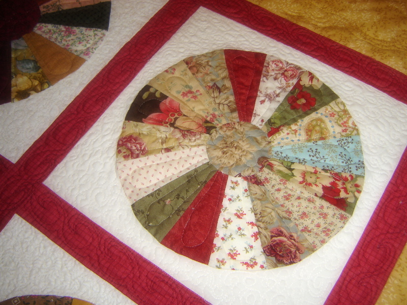 Al plato en el circulo del centro le acolché una flor y cada pieza como si fuera un pétalo.Por fuera en lo blanco del bloque es como gusanillo y en el marco rojo del bloque como unas ondas.