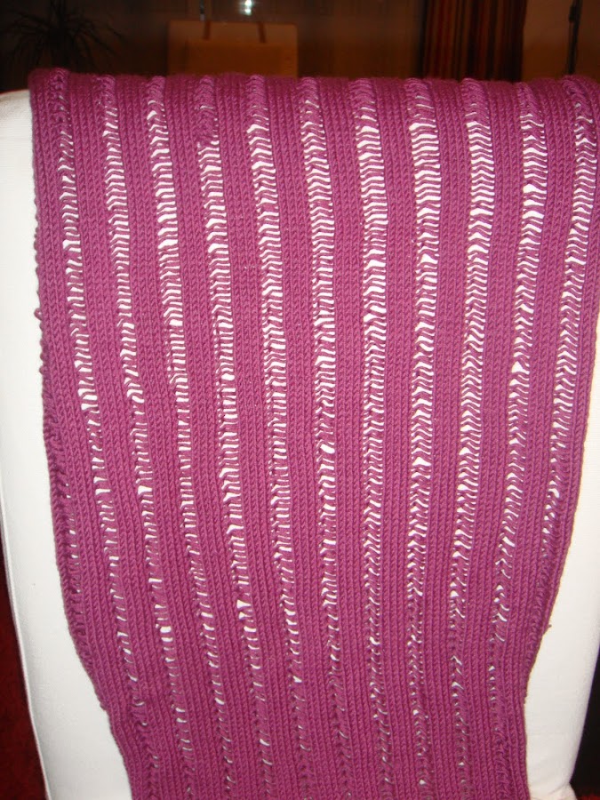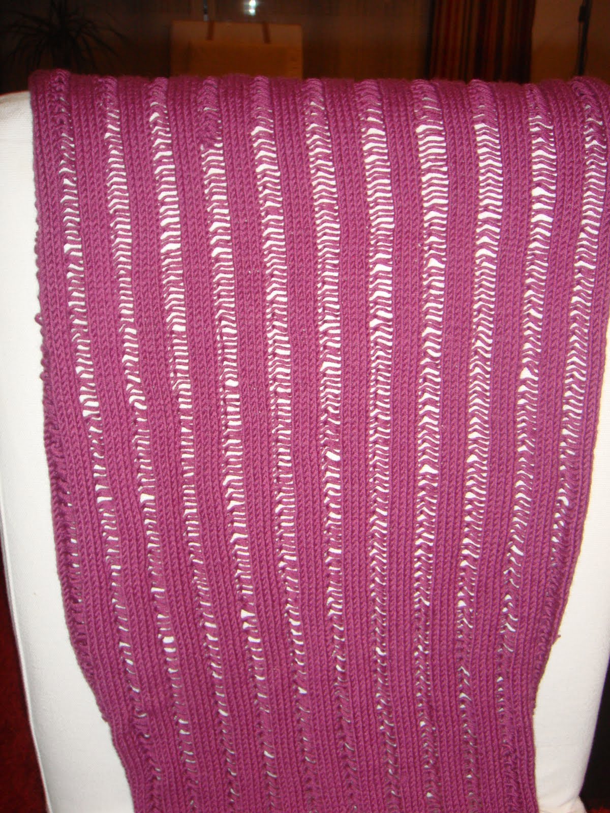 Se va tejiendo y es en la ultima vuelta cuando se dejan caer varios puntos (en concreto un punto de cada cinco). El punto que se deja caer se va soltándolo hacia abajo a lo largo de toda la bufanda..y es entonces cuando hace este efecto de calado que se ve en la foto.