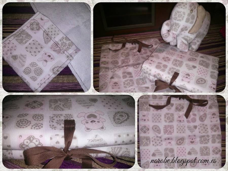 En esta foto podéis ver cómo queda el cambiador dobladito y cerrado con el lazo; la bolsa para meter mudas limpias o ropita para cambiarlos, la cual solo va forrada interiormente con tela de algodón; y por último, toallitas pequeñas que hice con lo que sobró de la tela del cambiador, que como lleva plástico no calan las "babitas".