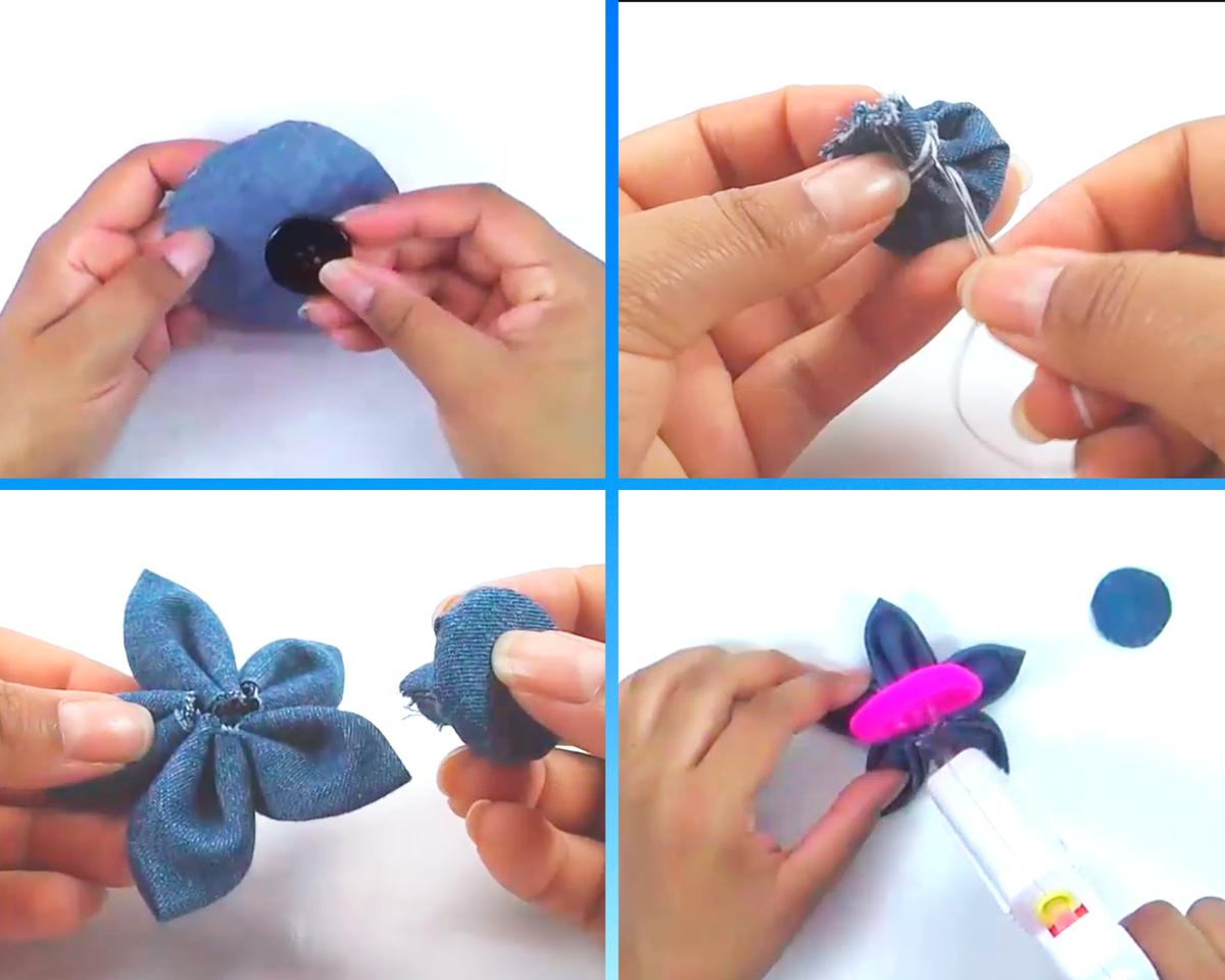 Repite el proceso con 4 círculos más usando la misma aguja e hilo para que queden uno junto al otro y cierra la costura formando una flor.