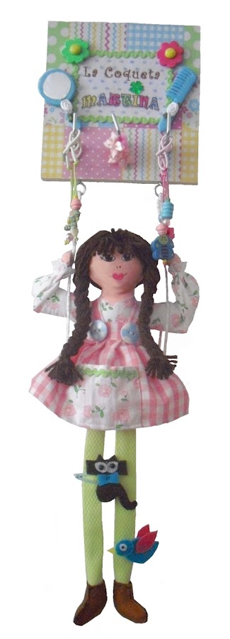 Hoy os quiero mostrar este porta coletas que me encargan a menudo. Es una idea original para regalar a una niña coqueta. Esta hermosa muñeca de trapo que se balancea en su columpio, mientras se encarga de guardar un montón de adornos para el pelo. Cuelga las coletas, sujeta las pinzas a sus largas trenzas, pincha sus esbeltas piernas con graciosos adornos. En el bolsillo del vestido puedes guardar lo que quieras. Es original y divertido mantener en orden los complementos para el cabello; y lo mejor de todo es que está personalizado con el nombre de la niña. Contadme si os gusta.