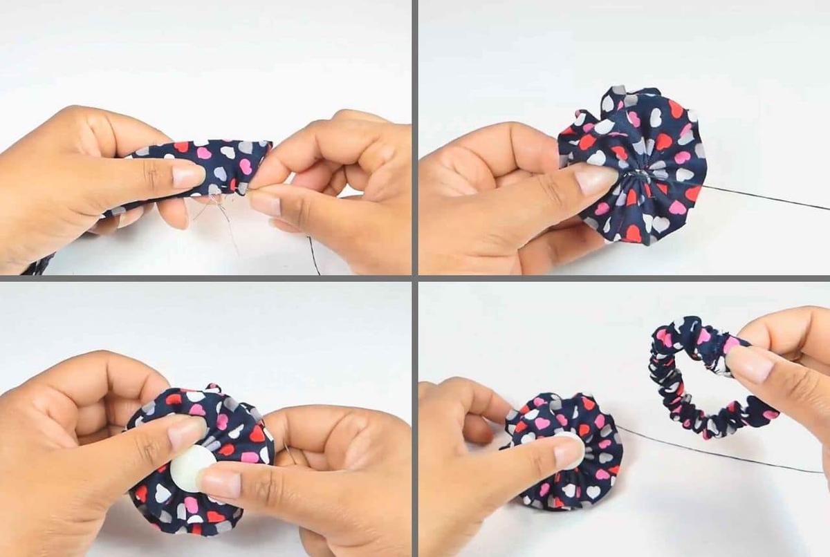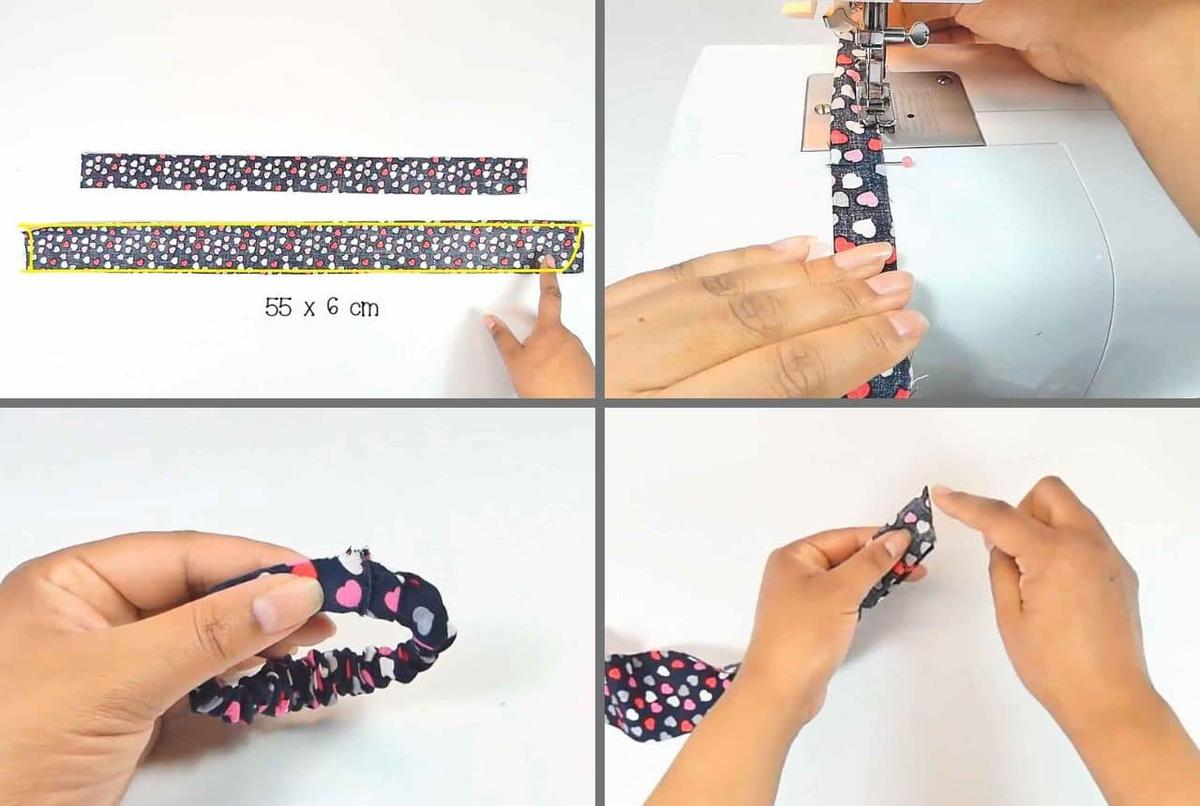 Da la vuelta la pieza e introduce 20 cm de elástico, cose los extremos para formar el scrunchies.