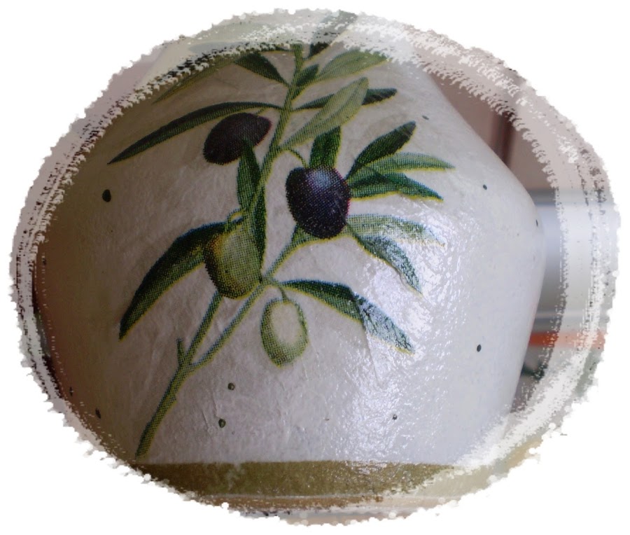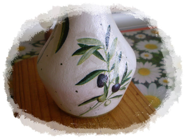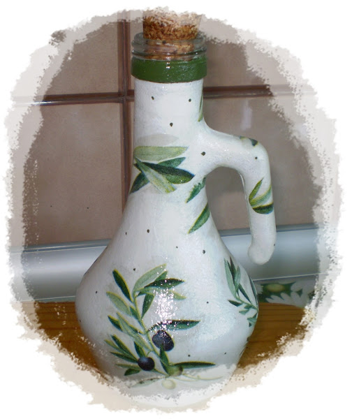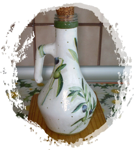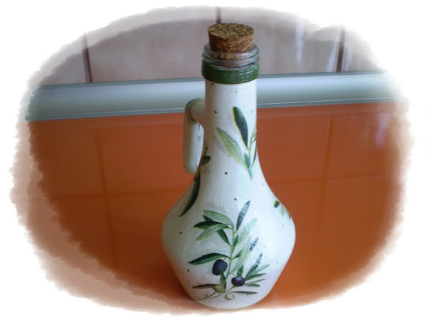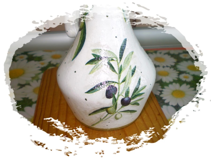 Tenía una servilleta que le venia genial, porque como veis son motivos de ramas de olivo, así que, ¿que mejor imagen para una aceitera?.