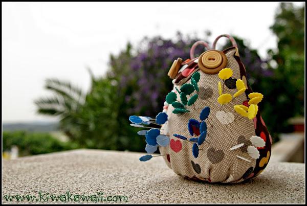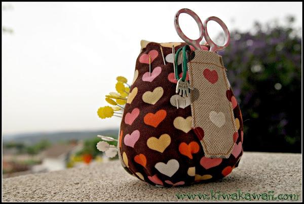 Añadí un bolsillo trasero para guardar las tijeras de cortar hilos, que las necesito siempre a mano. A la izquierda las agujas de coser a mano (las uso bien poco, jajaja), y un charm "handmade" para decorar (y para colgar el búho de la pared cuando necesito toda la mesa libre).