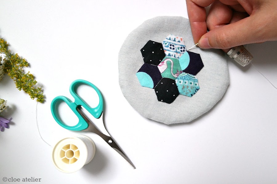 Cosemos nuestros hexágonos de tela unidos a la base del alfiletero por el derecho, siempre con puntada escondida para un resultado óptimo. Y por último, rellena y cierra la abertura.