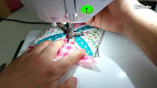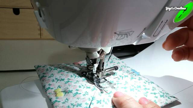 Cortamos el sobrante de tela y colocamos nuestra pieza principal sobre la otra pieza de tela (la que cortamos un poquito más grande, ¿recuerdas?, enfrentando sus derechos, y cosemos todo alrededor haciendo curva en las esquinas, y dejando unos 5 cm abierto para luego darle la vuelta y rellenarlo: