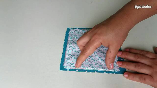 La que corté un poco mas grande la voy a apartar un momento, y la que corté justo del tamaño del cuadrado la voy a colocar dentro de la pieza cuadrada con el derecho a la vista, así:
