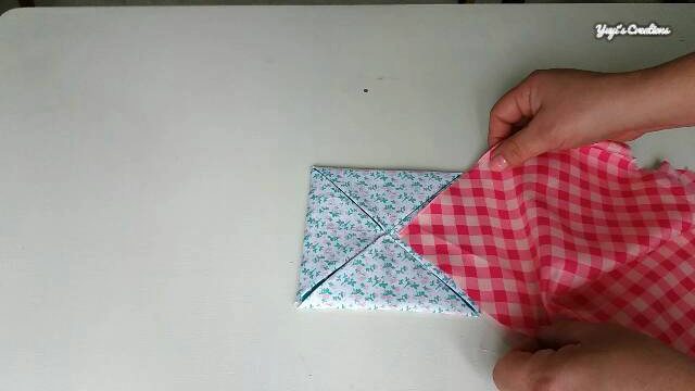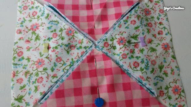 Colocamos cada triángulo en su posición y sujetamos con alfileres, luego vamos a doblar cada uno de sus lados, así como ves en la imagen de abajo: