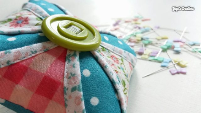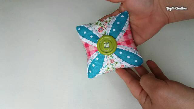Luego volteamos y cosemos en el medio el botón, un pompón o lo que te apetezca ponerle en el centro. Luego rellenamos con la guata, y cosemos la abertura. Yo recomiendo cerrar la abertura a mano con una puntada escondida porque a máquina se notará la costura sólo por uno de sus lados.