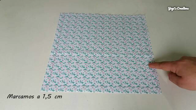 Vamos a empezar haciendo unos dobleces en la tela. Es importante que los dobleces de nuestra tela principal queden perfectos, así que para ayudarme a que así sea, voy a marcar una línea por el derecho de la tela y a 1,5 cm del borde por todos los lados.