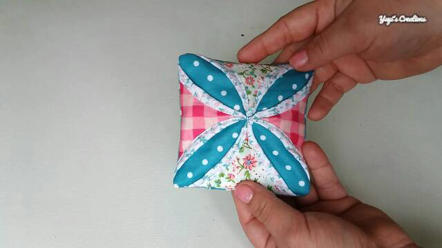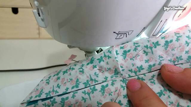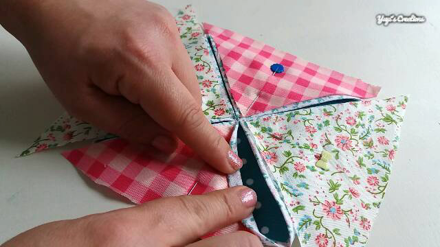 Ahora cerramos los triángulos y cosemos justo en el centro para fijar las puntas: