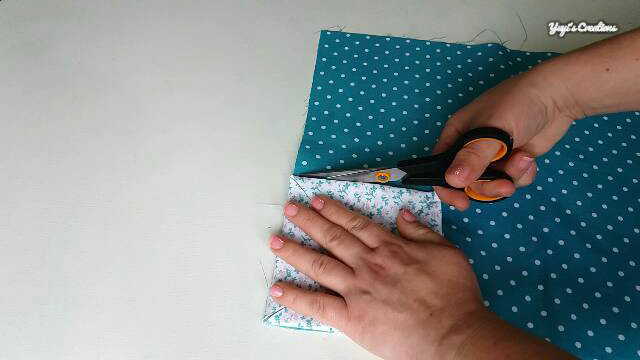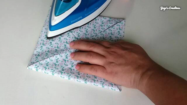 Luego vamos a llevar la punta de las esquinas hacia la marca que queda luego de planchar los dobleces, y planchamos, así: