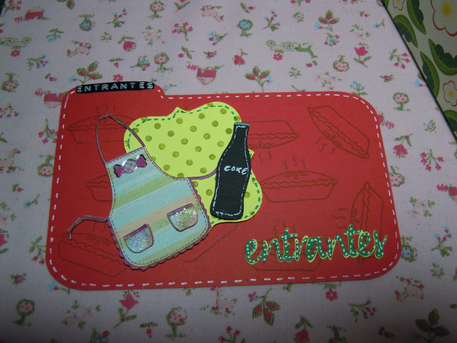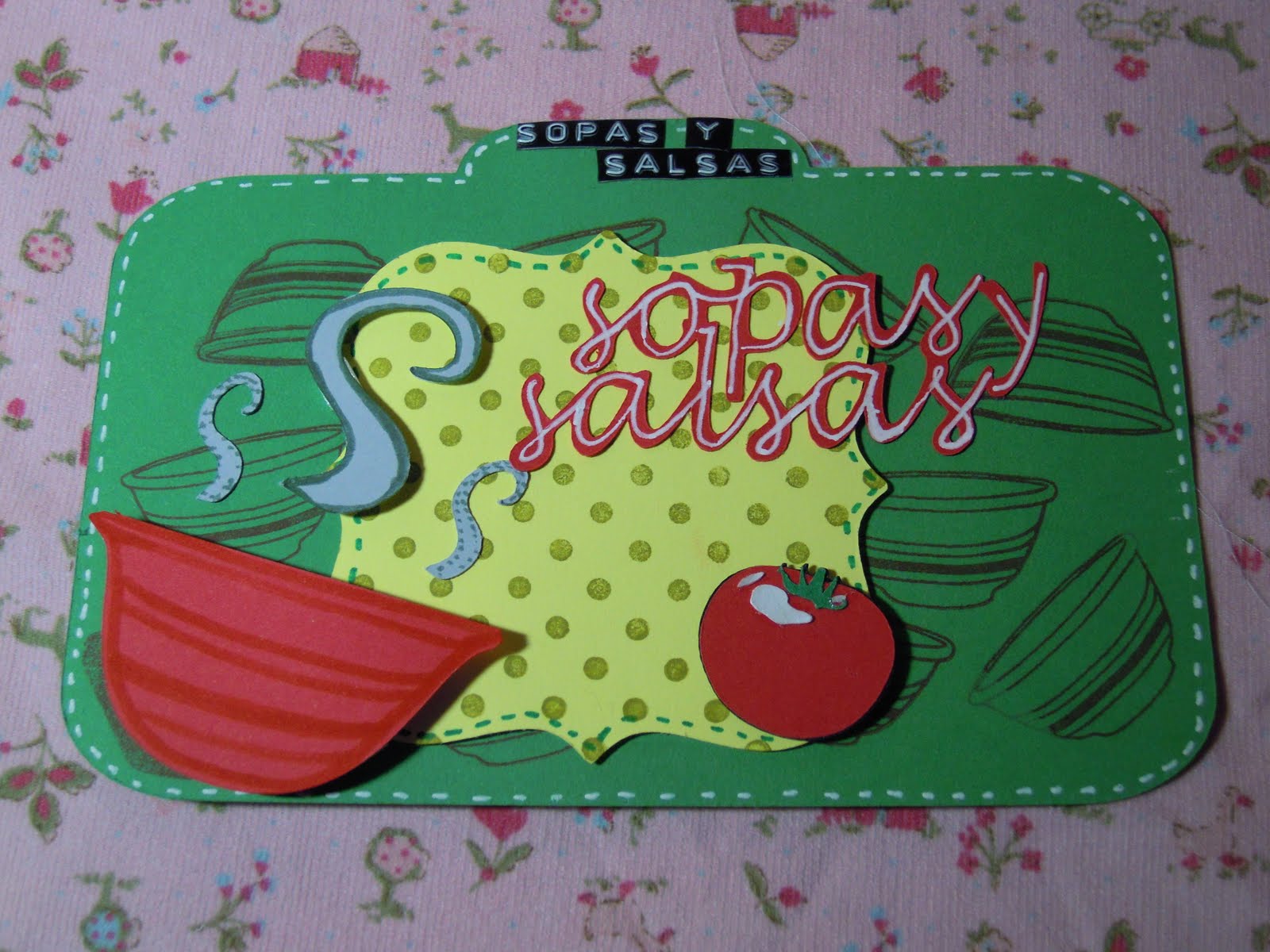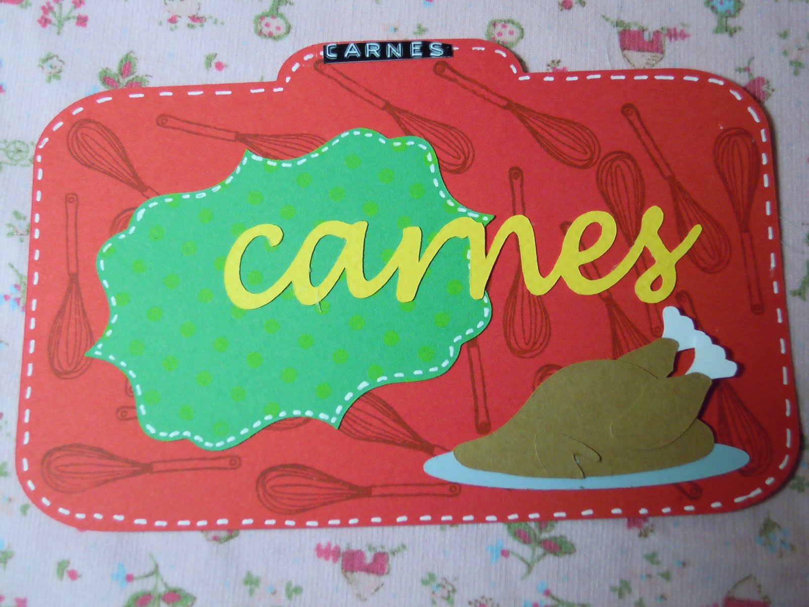 En el podemos ver diferentes separadores, el interior del archivador está hecho con los mismos papeles de cosmo cricket que el exterior, el fondo en cambio lo he hecho con los sellos de Hero Arts What"s cooking. Vamos a ver uno a uno los separadores:
