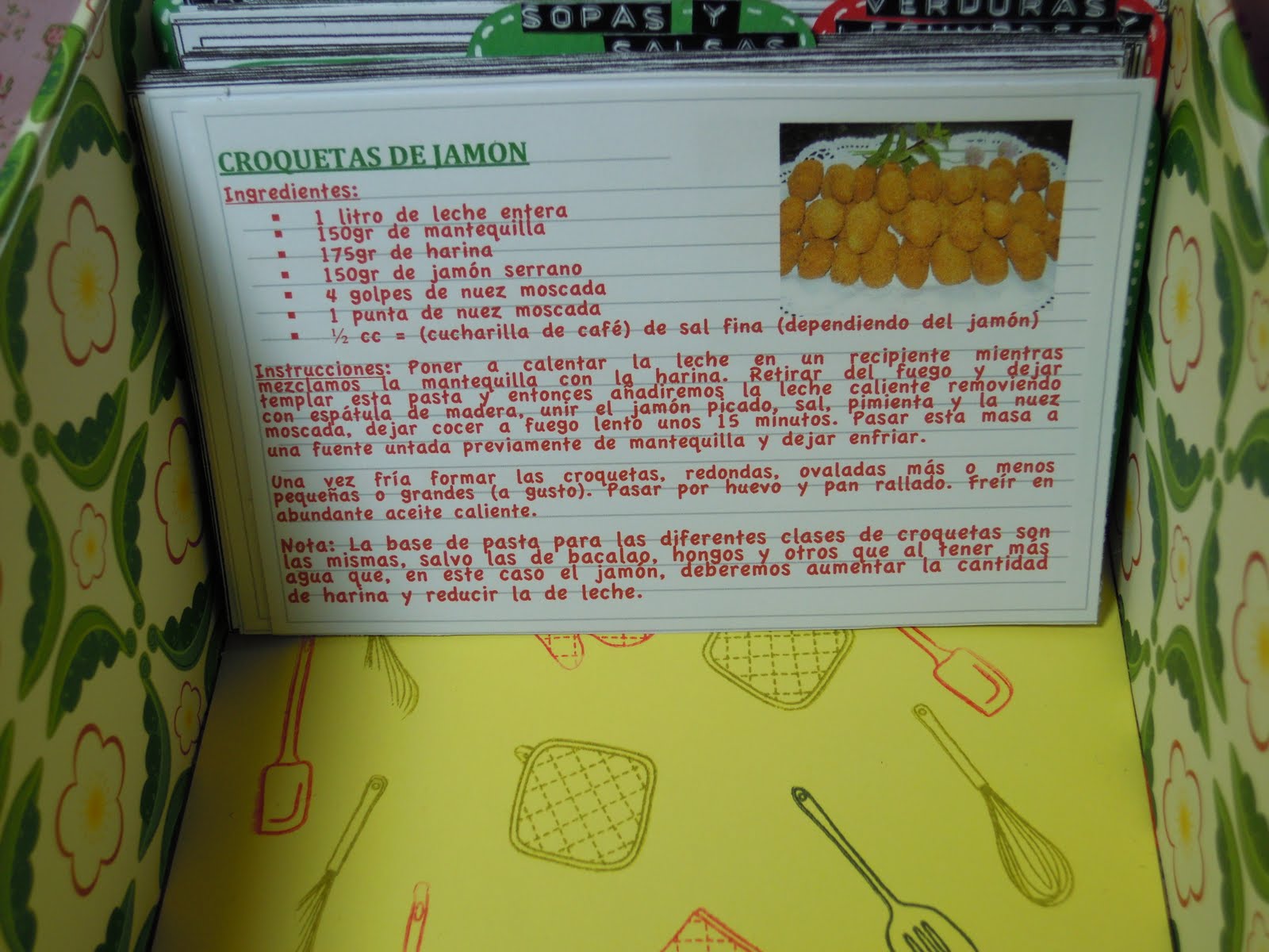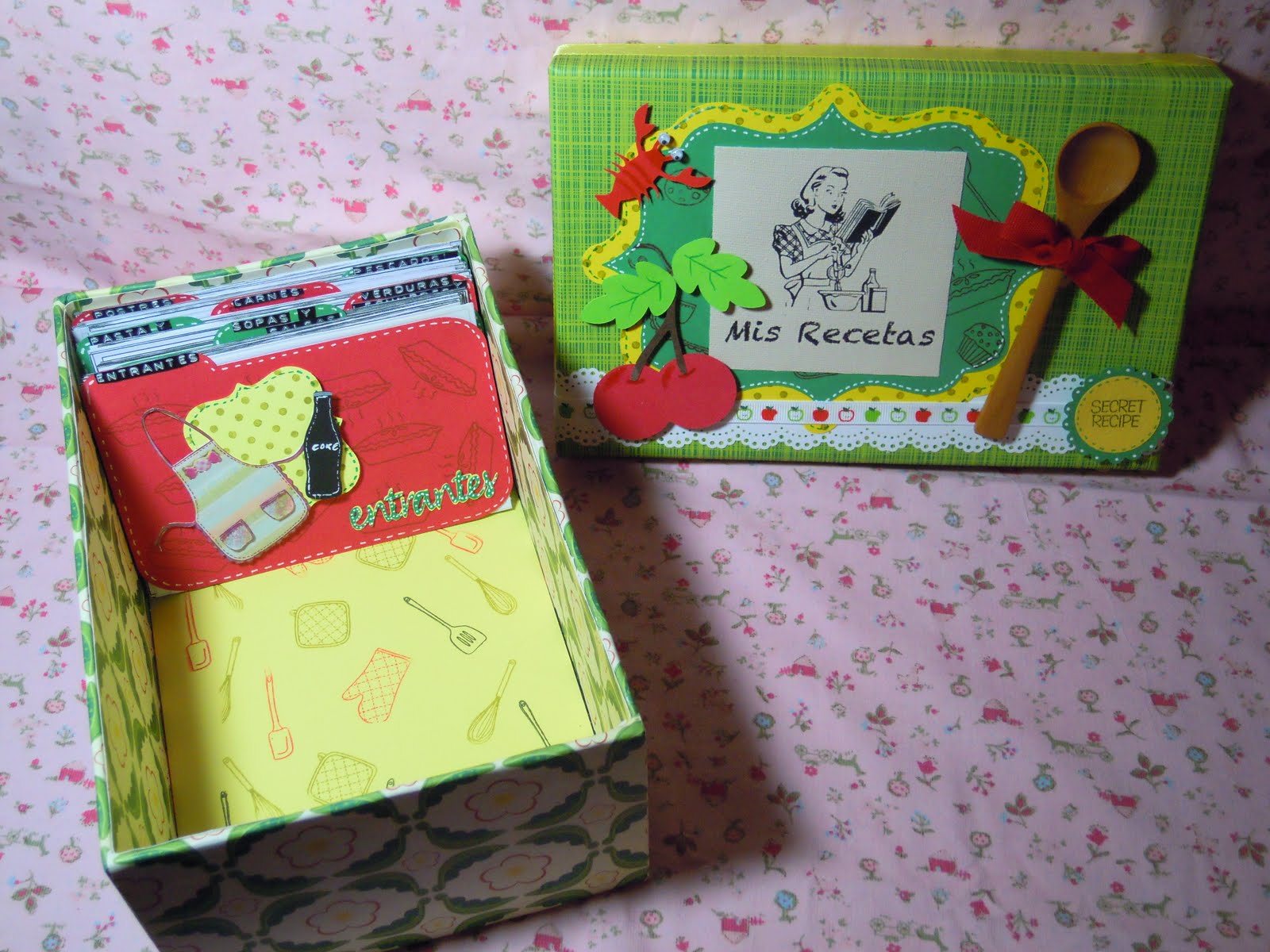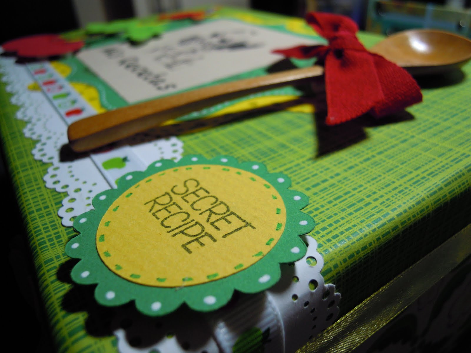 Como base he utilizado una caja de cartón, en cuanto a los papeles de scrapbooking que he utilizado es la colección Garden Variety de Cosmo Cricket, en cuanto a la decoración de la tapa del archivador está hecha con una troqueladora de borde de Martha Steward, en la que he colocado encima una cinta con manzanas estampadas y un troquel de scallop con un círculo en el que he estampado "secret recipe" (receta secreta). También le he añadido unos marcos que he cortado con la cricut, en cartulina amarilla y verde. En el amarillo he estampado el sello de clings "dots" y en el verde el sello de Hero Arts: What´s Cooking?