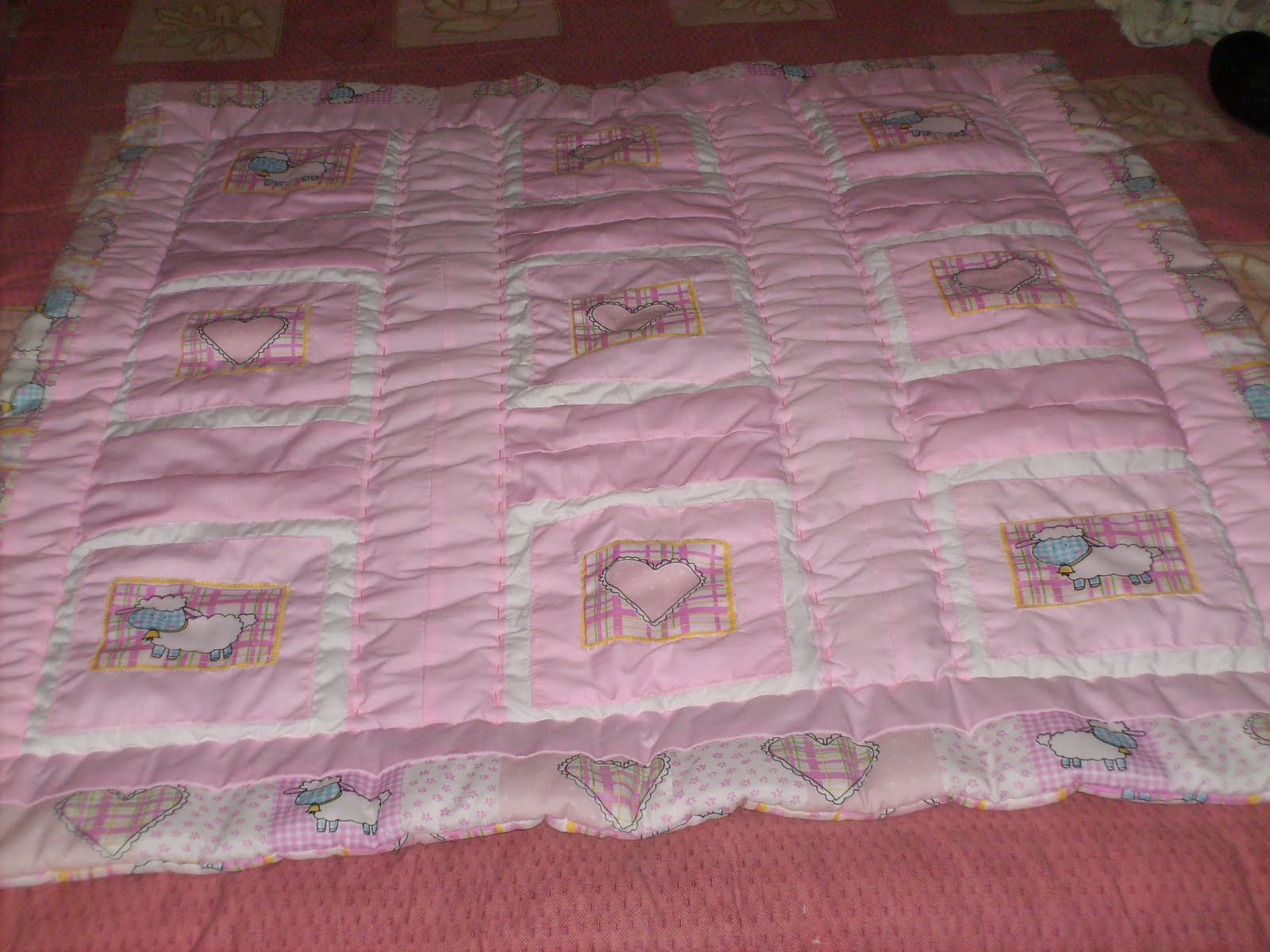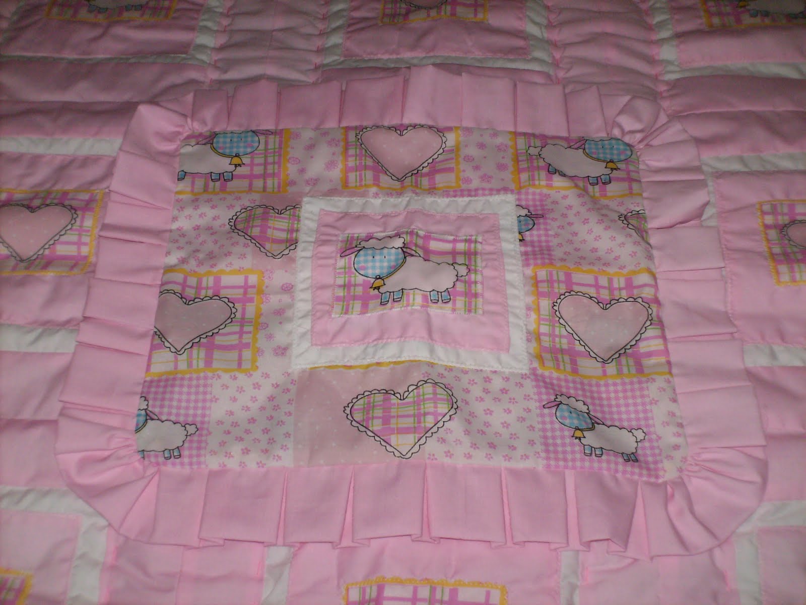 Este trabajo esta elaborado en patchwork utilizando cuadros del mismo diseño que trae la tela como aplicaciones, acompañada con una funda para la almohada.. jugué con los colores blanco y rosado los cuales predominan de fondo y se prestan especialmente para una niña.