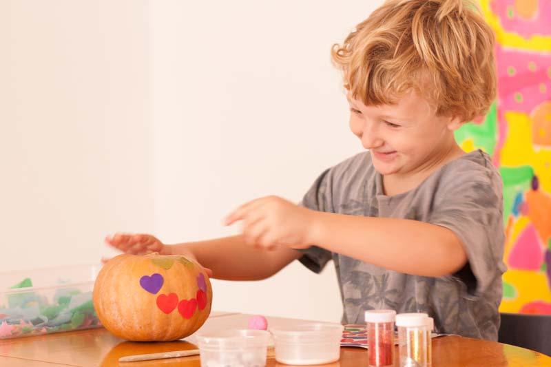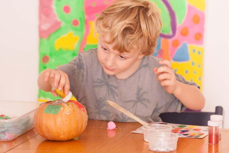 Una vez lo tengas todo preparado puedes animarle a que manipula la calabaza, que la palpe, que la huela y que la observe (esta actividad sería conveniente sobretodo para niños y niñas de entre los 2 y los 4) una vez haya estada un rato manipulándola dile que puede empezar a decorarla.