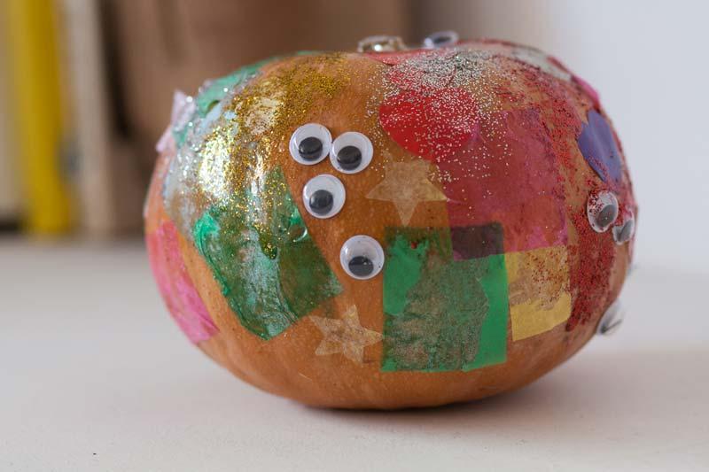 A todas estas ideas que son de su propia cosecha hay que añadir la que yo le he propuesto, decorar una calabaza de verdad con diferentes materiales y ¿qué crees que ha dicho? pues claro, que sí.