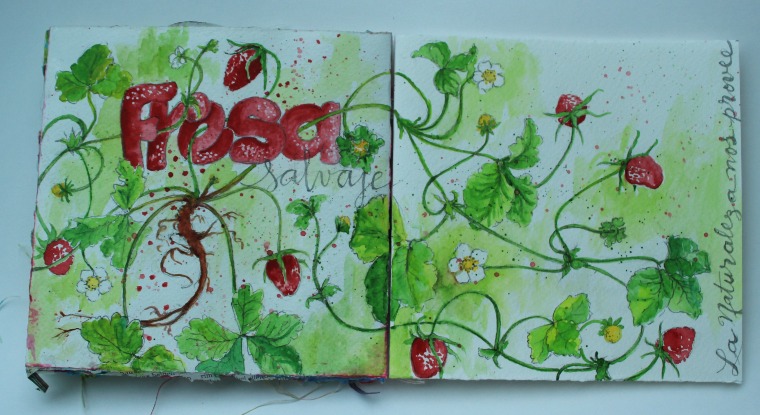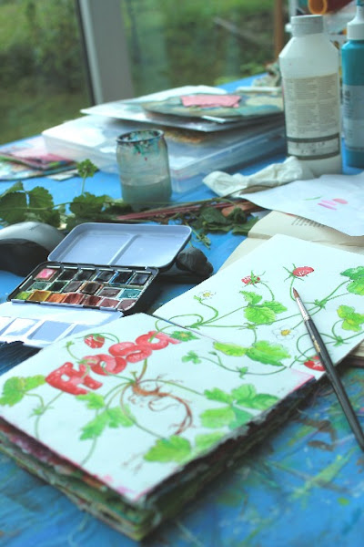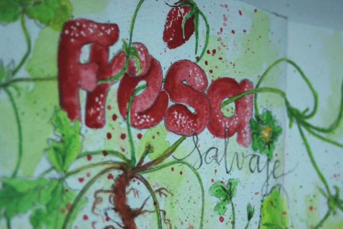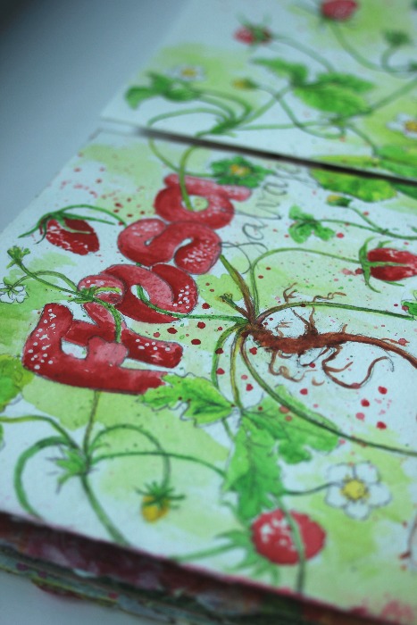 El diseño de las letras no me lo pensé demasiado, sólo me dije que debían ser "gorditas" redondeadas como las mismas fresas y luego el color pues ya estaba dado. Decidí hacer mi página al estilo clásico de acuarela, nada de tinta, sólo lápiz.