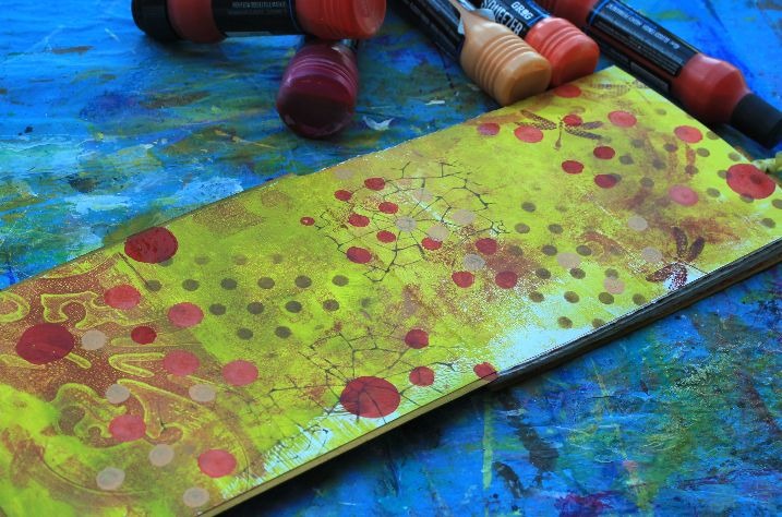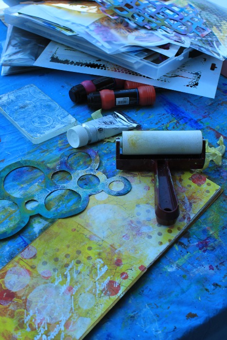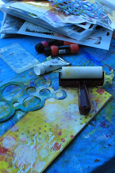 Sigo con la placa Gelli, acrílicos y plantillas (algunas hechas por mi) porque debo adaptar mi fondo a la temática de mi página.
