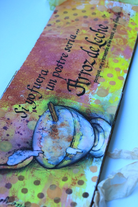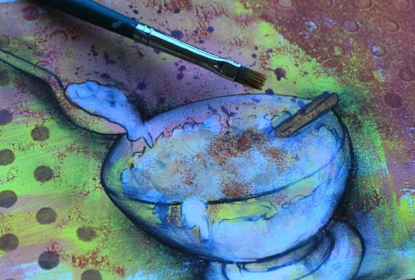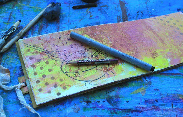 Con mis páginas ya listas, con los fondos pintados con acrílicos y la placa Gelli, es un "coser y cantar" bueno: "dibujar y pintar"...