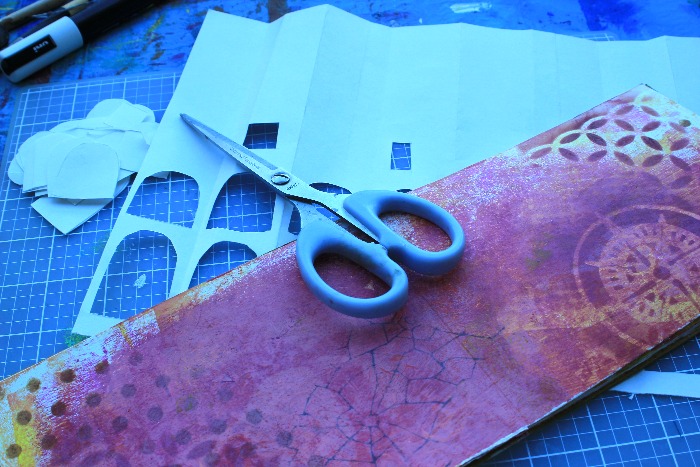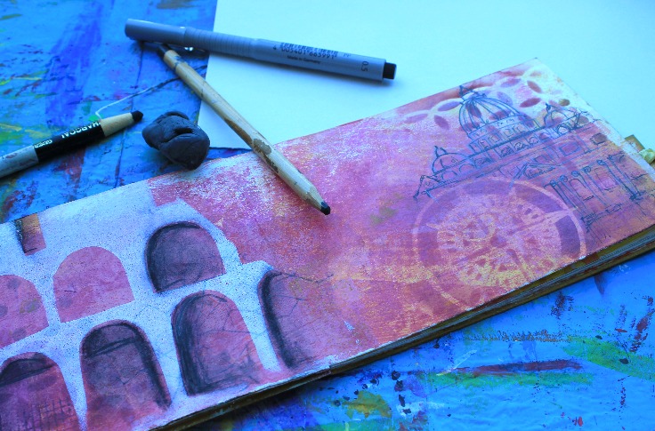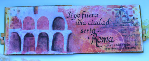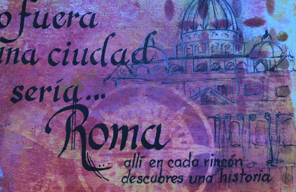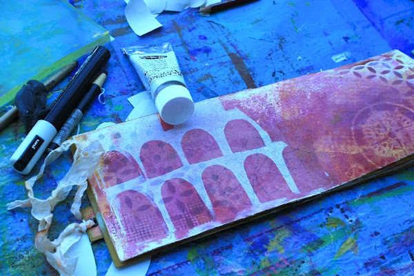 Ya con mis colores de base (trabajados con la placa Gelli) hice mi propia plantilla (tijeras y cartulina) y con la placa Gelli pinté mi versión muy estilizada del Coliseo